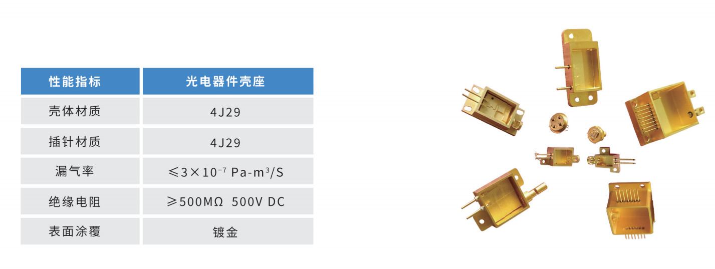 采用4J29 可伐合金矩形框,配合底板钎焊工艺,重量轻且强度高,封接效果好。引线与壳体之间采用电真空玻璃高温烧结,保证绝缘性和气密性。整体镀金,保证易焊性和防氧化。